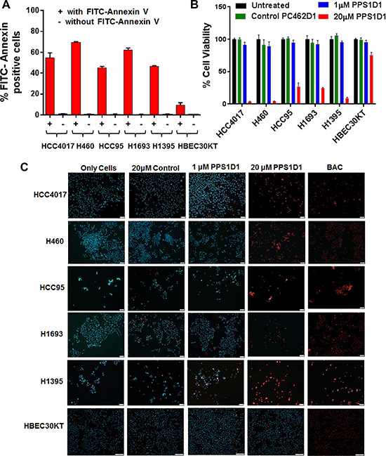 10,000 cells of HCC4017, H460, HCC95, H1693,H1395 and HBEC30KT were plated on chamber slides (Lab-Tek, Thermo Fisher, MA). On second day, cells were treated with PPS1D1 (1μM and 20 μM), control PC462D1 (20 μM) and 0.005% Benzalkonium chloride (BAC) in RPMI medium with 10% FBS containing 3% BSA ( KSFM media with 3% BSA for HBEC30KT). Chamber slides were washed with PBS three times. Cells were then stained with Hoechst 33342 (10 μg/ml) for 30 min in dark. Chamber slides were washed with 3× PBS. Cells were then stained with propidium iodide (1 mg/ml) for 15 mins. Cells were washed with 3× PBS and imaged using Fluorescence Microscope (Olympus BX-53).