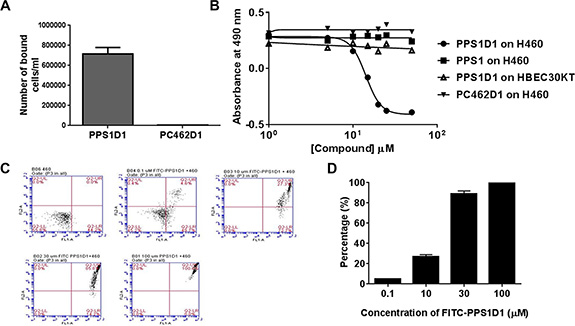 Figure 6: Comprehensive in vitro activity validation of PPS1D1 on H460 lung cancer cell line. (A) Magnetic bead pulls down of H460 with PPS1D1, but not with control compound PC462D1 (Error bars represent standard deviation). (B) Standard MTS cell viability assay of H460 and normal HBEC30KT cells treated with PPS1D1, PPS1 and PC462D1. Only PPS1D1 induce the cell cytotoxicity on HCC4017, while no effect on normal HBEC30KT cells. (C) Flow cytometry studies of PPS1D1-FITC binding to H460 cells in the presence of Propidium iodide (PI). H460 cell population significantly moved to double positive region when PPS1D1-FITC concentration increases. (D) Quantification of FITC and PI double stained region.