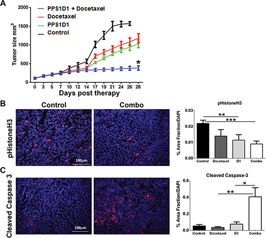 Figure 7: In vivo treatment of PPS1D1 on mice bearing H460 xenografts suppresses tumor growth. (A) Mice bearing subcutaneous H460 xenografts were treated with PPS1D1 (D1, n = 8, 0.25 mg/mouse, 3 times per week on a M-W-F schedule), PC462D1 (Control, n = 8, 0.25 mg/mouse, 3 times per week on a M-W-F schedule), docetaxel (n = 8, 5 mg/kg, 2×/week), or the combination of PPS1D1 and docetaxel (n=8, combo). Mean +/− SEM tumor volume is displayed. PPS1D1 displayed tumor burden effects as a single agent as well as in combination with docetaxel. (B, C) Tumor tissue harvested after 4 weeks of therapy was evaluated for cell proliferation (B, phopsho-histone H3) and apoptosis (C, cleaved caspase-3) by immunofluorescence. DAPI was used as a counterstain and to normalize quantification of reactivity. *p < 0.05; **p < 0.01; ***p < 0.005. The PPS1D1 and docetaxel combination therapy strongly reduce cell proliferation and induce apoptosis.