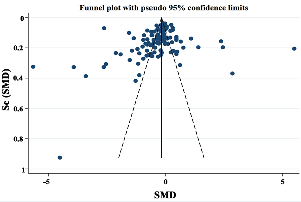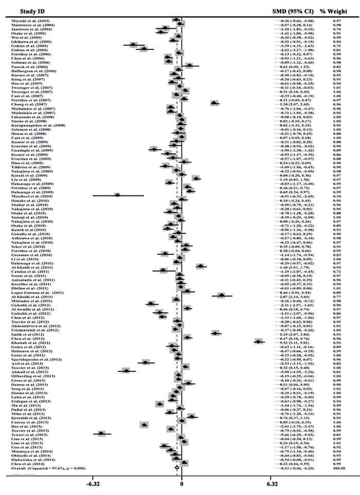 Among the 107 studies, a total of 25,675 controls and 19,319 cases were enrolled until August, 2015. Geographic regions were various, among which 46 studies from Asia, 39 studies from Europe, 19 studies from America, and 3 studies from Africa. 16 types of malignancies were investigated in this meta-analysis, with digestive system cancers accounting for the largest percentage (43 studies); other types included: breast cancer (20 studies), prostate cancer (13 studies), endometrial carcinoma (11 studies), lung cancer (5 studies), renal cancer (3 studies), acute leukemia (3 studies), non-Hodgkin’s lymphoma (3 studies), Hodgkin’s lymphoma (1 study), multiple myeloma (2 studies), melanoma (1 study), thyroid cancer (1 study), and tongue cancer (1 study). Circulating samples included serum (65 studies) and plasma (37 studies), while 5 studies did not mention the exact one. Most researches provided the mean concentrations of circulating adiponectin levels and the SDs of them. SDs from 11 studies were calculated based on the sample size and P values. 96 studies had NOS scores greater than 6 along with 11 studies had scores of 5. The main characteristics of eligible articles were listed in Table 1.