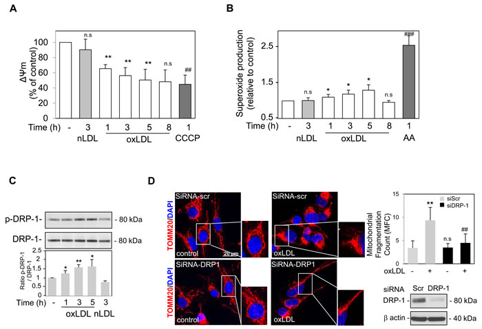 Figure 1: Oxidized LDL induced mitochondrial depolarization, dysfunction and Drp-1 dependent fission in human VSMC. A. Time course analysis of the mitochondrial membrane potential (ΔΨm). Human VSMC were labelled with the JC-1 dye and stimulated with oxidized or native LDL (respectively oxLDL and nLDL) (200 µg ApoB/mL), at the indicated times or with CCCP (20 µM). JC-1 exhibits potential-dependent accumulation in mitochondria. At low membrane potentials, JC-1 exists as a monomer and produces a green fluorescence (emission at 520 nm). At high membrane potentials or concentrations, JC-1 forms aggregates and produces a red fluorescence (emission at 590 nm). The ratio 590/520 is indicative of mitochondrial membrane depolarization. The data are expressed as mean ± SEM of 5 separate experiments, ** P < 0.01 and ## P < 0.01 indicate significance, n.s indicates no significance. B. Mitochondrial superoxide formation was detected using MitoSOX Red dye (excitation/emission at λ = 510 nm/580 nm) in human VSMC treated with oxidized or native LDL (respectively oxLDL and nLDL) (200 µg ApoB/mL) or Antimycin A (AA) (10 µM) at the indicated times and the relative fluorescence intensity is quantified. The data are expressed as mean ± SEM of 5 separate experiments, * P < 0.05, ** P < 0.01 and ## P < 0.01 indicate significance, n.s indicates no significance. C. Immunoblot analysis of the fission protein Drp-1 following oxidized or native LDL treatment. Human VSMC were stimulated with oxidized (oxLDL) or native LDL (nLDL) (200 µg ApoB/mL) at the indicated times and Western blot experiments were performed on total protein extracts using anti-phosphorylated Drp-1(Ser616) antibody and total Drp-1 expression was used as loading control. Blots are representative of 4 independent experiments. The graph represents values of phosphorylated Drp-1(Ser616) band intensity after normalization for total Drp-1 band intensity by densitometry, * P < 0.05 and ** P < 0.01 indicate significance. D. Representative images of mitochondrial fragmentation/fission. Reversal of the mitochondrial fragmentation in human VSMC was achieved using siRNA mediated knockdown of Drp-1 expression. Images are representative of human VSMC treated with oxidized LDL (200 µg ApoB/mL) for 5 h, undergoing siRNA Drp-1 or siRNA scramble transfection. Mitochondria were stained using an antibody against the outer mitochondrial membrane-localized protein TOMM20 (red). Nuclei (blue) were stained with DAPI (4′,6-diamidino-2-phenylindole). The graph represents the quantification of the MFC and shows a significant reduction in oxidized LDL stimulated cells transfected with siRNA Drp-1. Data are expressed as mean ± SEM of 3 separate experiments, ** P < 0.01 and ## P < 0.01 indicate significance, n.s indicates no significance.