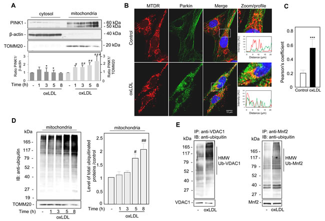Figure 2: Oxidized LDL induced the recruitment of PINK1 and Parkin to the damaged mitochondria and increased mitochondrial ubiquitinylated proteins in human VSMC. A. Immunoblot analysis of the 60-kDa full-length and the 50-kDa cleaved endogenous PINK1 expression in cytosolic and mitochondrial fractions of human VSMC treated with oxidized LDL (200 µg ApoB/mL) at the indicated times. The cellular fractions were probed for PINK1 and the cytosol and mitochondrial markers β-actin and TOMM20, respectively. Blots are representative of 4 independent experiments. The graph represents values (means ± SEM) of PINK1 band intensity after normalization for β-actin and TOMM20 by densitometry, * P < 0.05, # P < 0.05, ## P < 0.01 and ### P < 0.001 indicate significance. B. Representative images of Parkin translocation to the mitochondria, human VSMC were stimulated with oxidized LDL (200 µg ApoB/mL) for 5 h. Mitochondria were immunostained with Mito Tracker Deep Red (MTDR, red) and Parkin antibody. C. The Pearson coefficient indexes between Parkin and MTDR fluorescence intensity were determined in regions of interest (ROI) for 10 or more cells in 3 independent experiments. The values are the means ± SEM; ** P < 0.01 indicates significance. D. Immunoblot analysis of total ubiquitinated proteins in mitochondrial fractions of human VSMC treated with oxidized LDL (200 µg ApoB/mL) at the indicated times. The cellular fractions were probed for ubiquitin and immunoblots are representative of 3 independent experiments. The graph represents the densitometric analysis of mitochondrial ubiquitinated protein intensity relative to untreated control, # P < 0.05 and ## P < 0.01 and indicate significance. E. Immunoprecipitations of VDAC1 and Mnf2 from human VSMC confirm ubiquitylation of both proteins. Oxidized LDL (200 µg ApoB/mL, 5 h) treatment increases high molecular weight (HMW) ubiquitylated species of VDAC1 and Mnf2. Using specific antibodies VDAC1 and Mnf2 were immunoprecipitated from lysates, western blotted and probed with anti-ubiquitin, anti-VDAC1 and anti-Mnf2 antibodies.
