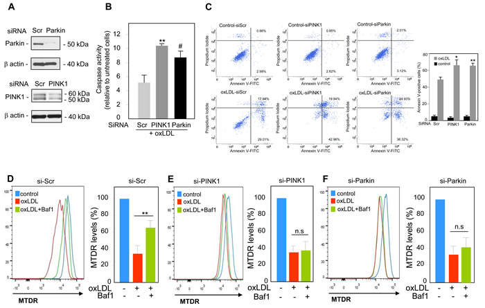 Figure 4: PINK1 and Parkin knockdown enhances human VSMC apoptosis mediated by oxidized LDL. Analysis of oxidized LDL-induced apoptosis in human VSMC transfected with scrambled (si-Scr, 100 nM), (si-Parkin, 100 nM) or (si-PINK1 100 nM), siRNA for 24 h and then incubated with oxidized LDL (200 µg ApoB/mL) for 16 h. A. shows the western-blot analysis of PINK1 and Parkin expressions in human VSMC after siRNA transfection. B. Assessment of caspases activity in PINK1 and Parkin-deficient human VSMC. Whole cell detection of caspase activity in apoptotic or caspase-positive cells was performed using the membrane-permeant, fluorescent inhibitor-based FLICA caspase probes as described under “Materials and Methods”. The data are expressed as mean ± SEM of 3 separate experiments, ** P < 0.01 and # P < 0.05 indicate significance. C. Apoptosis of control, PINK1 and Parkin-deficient human VSMC stimulated with oxidized LDL (200 µg ApoB/mL) for 16 h was determined by Annexin V/PI staining followed by flow cytometry analysis. The graph represents the quantitative analysis of the percentage of Annexin V-FITC positive cells. The data are expressed as mean ± SEM of 5 separate experiments, * P < 0.05 and ** P < 0.01 indicate significance. Mitophagy assessment in D. human VSMC transfected with scrambled siRNA (si-Scr); E. human VSMC transfected with PINK1 siRNA (si-PINK1) and F. human VSMC transfected with Parkin siRNA (si-Parkin), and incubated with oxidized LDL (200 µg ApoB/mL) for 8 h. Cells were treated with or without Baf1 (10 nM) 3 h before analysis to block lysosomal degradation. Human VSMC were then stained with MTDR for flow cytometry analysis. The data are expressed as mean ± SEM of 6 separate experiments, ** P < 0.01 indicates significance.