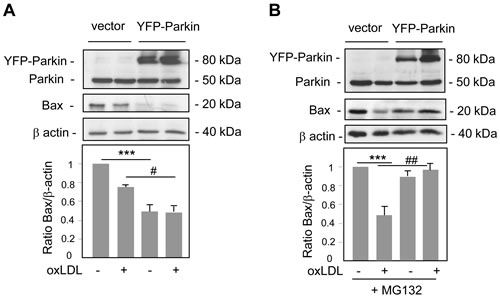 Figure 6: Parkin overexpression decreases Bax levels. A. Immunoblot analysis of Bax and Parkin expression in human VSMC transfected with YFP-Parkin or control vector, and incubated with oxidized LDL (200 µg ApoB/mL) for 8 h. Blots are representative of 3 independent experiments. The graph represents values (means ± SEM) of Bax band intensity after normalization for β-actin by densitometry. *** P < 0.001 and # P < 0.05 indicate significance. B. Immunoblot analysis of Bax and Parkin expression in human VSMC transfected with YFP-Parkin or control vector, pretreated with a proteasome inhibitor MG132 (10 µM) and incubated with oxidized LDL (200 µg ApoB/mL) for 8 h. Blots are representative of 3 independent experiments. The graph represents values (means ± SEM) of Bax band intensity after normalization for β-actin by densitometry. *** P < 0.001 and ## P < 0.01 indicate significance.