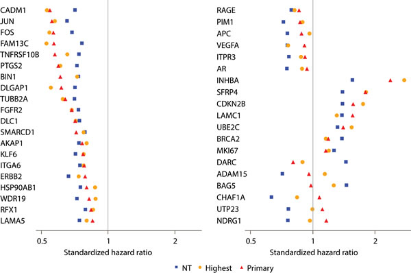 Of 732 candidate cancer-related genes assayed, 5 genes were excluded due to poor analytical performance, yielding 727 evaluable genes (Figure 1a). Controlling the FDR at 20%, 46 genes were predictive of cR in NT, indicating that gene expression patterns in NT adjacent to prostate tumor can predict clinical outcome in PCa. Among these 46 genes, 39 (85%) were associated with cR in tumor tissues as well (FDR < 20%) (Figure 2, Table 2).