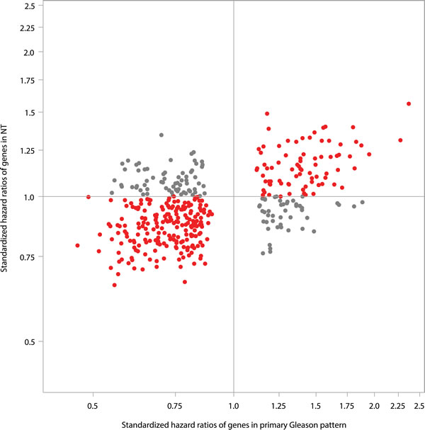 A pre-specified aim of the original gene identification study conducted on RP specimens was to assess gene expression in NT adjacent to prostate tumor, where “adjacent” was defined as ≥3-mm distant from tumor. The goal of this analysis was to identify gene expression changes in NT that could predict clinical outcome and to compare the gene expression patterns from NT to tumor tissue. Additionally, post-hoc analyses were conducted to evaluate if GPS, developed using the tumor-containing tissue, was predictive of outcome when applied to gene expression derived from NT specimens. In this study we asked whether identification of genes in NT would provide evidence for a biologically meaningful field effect in the tumor-containing prostate and identify early markers of aggressive PCa assayable in non-tumor tissue.