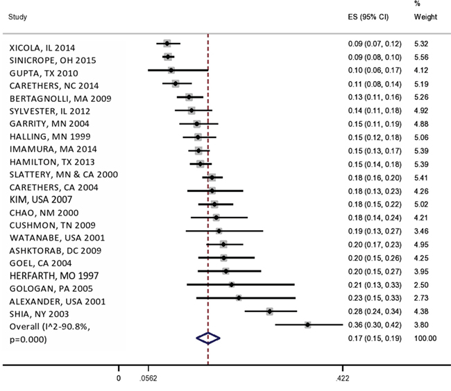 The percentage of males were found in 18 studies, with the median of 53% [1, 17-29, 31, 34-36]. Our data also showed that 61% of the population were older than 60 years (Table 2). In our reviewed papers, only 7 studies indicated AA percentage, with the median of 9% and IQR of 7-54 AA suggesting large heterogeneity within the studies [1, 17-21, 36]. Fourteen studies identified colonic location of tumors, with a median of 46% in the distal colon. Only 12 studies provided staging with a median of 53% of them at stage III and IV [1, 16, 18-20, 24, 27-30, 35, 36]. Poor differentiation was found only in 15 studies with a median of 20%, suggesting more than 70 percent patients belonged to low grade type of tumor [1, 16-18, 20, 25-31, 34-36]. Mucinous type of histology was found only in 9 studies with a median of 13% and IQR of 11-34 [17-19, 22, 25, 26, 31, 34, 36]. We also analyzed KRAS mutation in 6 studies with median of 31% and IQR of 28-40 suggesting a significant association of CRC patients with KRAS in our study [1, 18, 21, 24, 35, 36]. BRAF mutation was identified in a studies with median of 9% and IQR of 7-14 indicating no significant association [1, 18, 24, 30, 35, 36].
