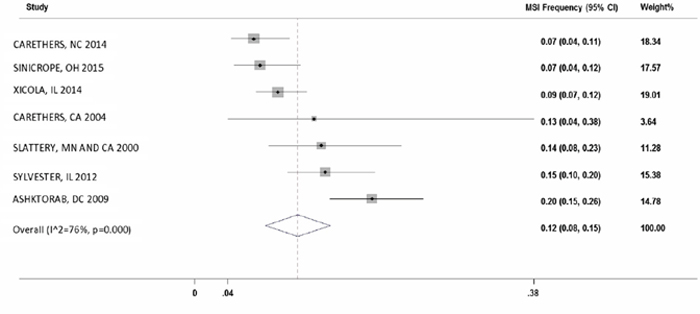 There were seven studies which reported MSI frequency in African Americans (n=1,349). The overall MSI percentage (95% CI) in these studies was 12% with I2 = 76% (8%-15%; Figure 3).