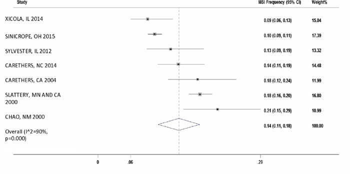 In order to get better insight, we analyzed 1,349 AA CRC subjects and 4,642 Caucasian CRC subjects in seven selected studies with mean MSI of 12% and 14%, respectively. This population-based study demonstrates the novel finding that MSI frequency in colon cancers from African American patients have almost same frequency compared to Caucasians. Our meta-analysis showed a large heterogeneity (I2 of 76% in AA vs. 90% in Caucasians) within the studies.
