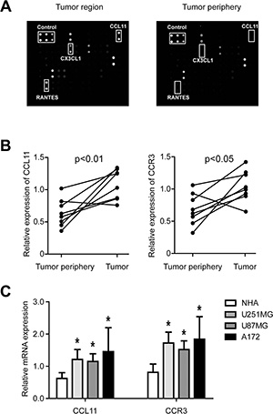 Figure 1: CCL11 and CCR3 were upregulated in GBM. (A) Antibody-based cytokine array analysis from clinical specimens demonstrated CCL11 levels were increased in tumors compared with adjacent tissues. (B) CCL11 and CCR3 mRNA expression in tumors and their adjacent tissues as measured by qRT-PCR (n = 8). (C) CCL11 and CCR3 mRNA expression in three GBM cell lines (U251MG, U87MG and A172) were upregulated compared with control cells (normal human astrocytes; NHA).*p < 0.05.