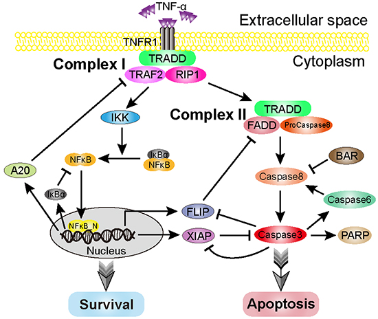 Figure 1: Schematic representation of the TNF-α-mediated cell-fate decision network. Upon TNF-α stimulation, it binds with the receptor, TNFR1, and subsequently activates the survival and apoptosis modules. The core part of the survival module is NF-κB, which induces a variety of anti-apoptotic factors, such as FLIP and XIAP. The caspase8 and caspase3 are the major initiator and executioner in the apoptosis module. Arrows and bars indicate activation/transcription and inhibition, respectively.