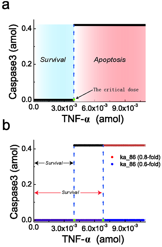 Treating the TNF-α dose as the control parameter, the responding steady-state of activated caspase3 concentration is presented in Figure 3a. Similar to experimental observation, the modeling signaling network exhibits a rapid, all-or-none behavior for caspase3. Starting from the resting state, the activated caspase3 concentration remains low with low TNF-α dose. However, when TNF-α dose increases beyond a critical dose (about 0.004 amol), the activated caspase3 concentration switches to a high steady state, indicating the occurrence of apoptosis in the cell. As a result, the critical dose of TNF-α reflects the threshold of cell death. At the low dose region ( < 0.004 amol), the concentration of activated caspase3 remains low and the cell is in the survival state (green area in Figure 3a). However, at the high dose region ( ≥ 0.004 amol), the cell is driven to the apoptosis state with a high concentration of activated caspase3 (red area in Figure 3a).