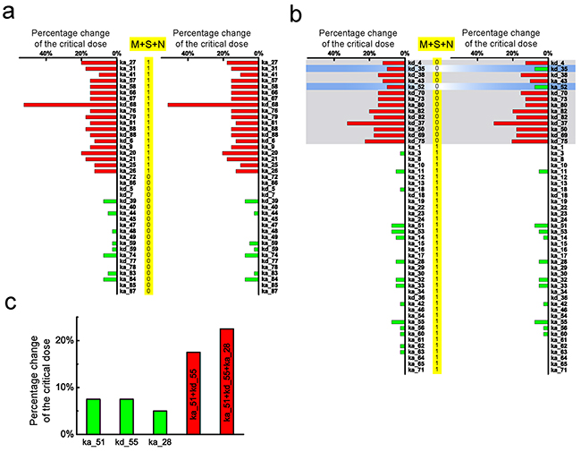 Figure 5: Comparison between parameter sensitivity of the modified model and the corresponding cancer-related gene mutation spectrum. a. The consistent subset of parameter sensitivity spectrum of the original model (left) and modified model with additional feedback (right). b. The inconsistent subset of parameter sensitivity spectrum of the original model (left) and modified model (right). The genes spectra are selected with the combined action of the three mutations. The gray region in (b) corresponds to 0 combined mutation, i.e. only 1 mutation out of three genes. Parameter sensitivity spectrum is not significantly influenced after considering the additional feedback except two parameters. In the gray region, two former inconsistent sensitive parameters (ka_52 and kd_35) become insensitive, resulting in consistent with the gene mutation spectrum. c. Comparison of parameter changes in isolation and co-occur. Three inconsistent insensitive parameters (marked in green), ka_51, kd_5 and ka_28, are changed at the two and three co-occur, respectively, resulting in a significantly accumulated influence on the change of critical dose (marked in red).