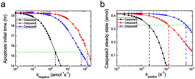 Figure 6: Effects of the two type feedback loops on apoptosis pattern. a. Negative feedback loop of caspases on NFκB decreases the initial time of apoptosis. Black, red and blue lines represent the change of apoptosis initial time with the negative feedback strength of caspase8, 3 and 6 on NFκB, respectively. b. Positive feedback loop of caspases on NFκB decreases the steady state level of execution protein. Black, red and blue lines represent the change of steady state of caspase3 with the negative feedback strength of caspase8, 3 and 6 on NF-κB, respectively. The green dashed lines correspond to the 20% decrease of the corresponding pattern, which are used to determine the reasonable strength region for the caspases.