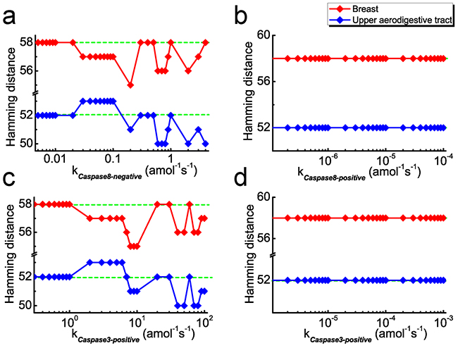 As shown in Figure 7a with the red line, the HD for new models are scarcely influenced with increasing negative feedback strength at the weak strength range (10-3 amol-1s-1< kcaspase8-negative < 2×10-2 amol-1s-1) for breast cancer. However, at the relatively strong strength range (2×10-2 amol-1s-1 < kcaspase8-negative < 4 amol-1s-1), the majority of the HDs are smaller than that of the original model. This tendency indicates that the parameter sensitivity of new model show better consistency with the mutated genes for breast cancer. In the case of upper aerodigestive tract cancer, a similar tendency could also been observed in the strength range of 2×10-1 amol-1s-1 < kcaspase8-negative < 4 amol-1s-1, as shown in Figure 7a with the blue line. Note that our results show that these ranges are insensitive to the cut-off value.