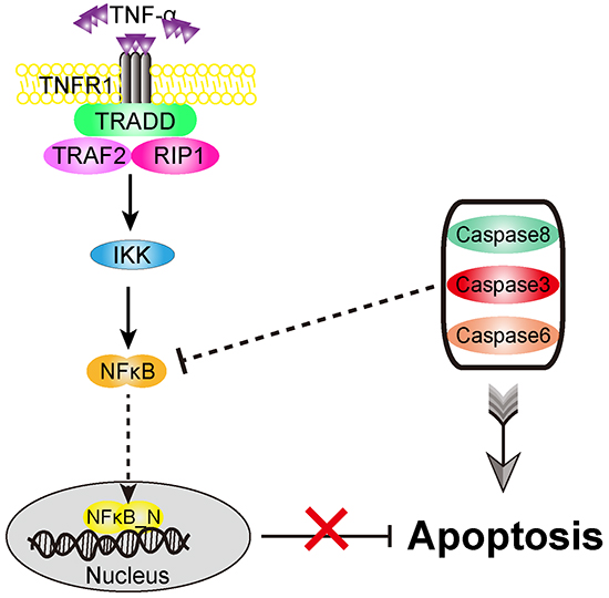 Overall, as shown in Figure 8, we predict that, in the TNF-α signaling pathway, the initiator caspase (caspase8) and the executioner caspases (caspase3, 6) which are tightly coupled to be a caspase module may directly or indirectly inhibit NFκB activation to suppress the expression of anti-apoptotic genes. Such a suppression provides a potential mechanism to convert cells from survival to apoptosis. Thus, the cancer cells with inactivating caspases mutations might interdict not only the normal apoptosis process, but also the caspase-mediated NFκB inactivation. However, it is uncertain whether the caspase-mediated NFκB inactivation is the primary action of the apoptosis module on the survival module. Additional studies are needed to identify the other crucial proteins in the apoptosis module, such as FADD, TARDD and PARP, which might provide more possible potential targets for cancer therapy and prevention.
