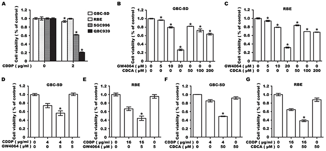 Figure 1: Farnesoid X receptor agonist GW4064 or CDCA enhances the sensitivity of GBC-SD and RBE cells to CDDP. A. Cell viability in GBC-SD, SGC996, RBE and QBC939 cells treated with CDDP for 48h. Columns, mean of three experiments; bars, SD. *P <0.05, treatment group compared with control group. B, C. Cell viability in GBC-SD (B) and RBE (C) cells treated with GW4064 or CDCA for 48h. Columns, mean of three experiments; bars, SD. *P <0.05, treatment group compared with control group. D, E. Cell viability in GBC-SD (D) and RBE (E) cells treated with CDDP alone, GW4064 alone or CDDP/GW4064 co-treatment for 48 h. Columns, mean of three experiments; bars, SD. *P <0.05, combination treatment group compared with CDDP-alone group. F, G. Cell viability in GBC-SD (F) and RBE (G) cells treated with CDDP alone, CDCA alone or CDDP/CDCA co-treatment for 48 h. Columns, mean of three experiments; bars, SD. *P <0.05, combination treatment group compared with CDDP-alone group.