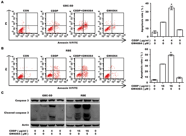Figure 2: Farnesoid X receptor agonist GW4064 enhances the apoptosis induced by CDDP in GBC-SD and RBE cells. A, B. Apoptosis rate analysis using Annexin V/PI flow cytometry in GBC-SD (A) and RBE (B) cells treated with CDDP alone, GW4064 alone and CDDP/GW4064 co-treatment for 48 h. Columns, mean of three experiments; bars, SD. *P <0.05, combination treatment group compared with CDDP-alone group. C. Level of total caspase 3 and cleaved caspase 3. Cells were exposed to CDDP alone, GW4064 alone and CDDP/GW4064 co-treatment for 36 h before harvested for IB.