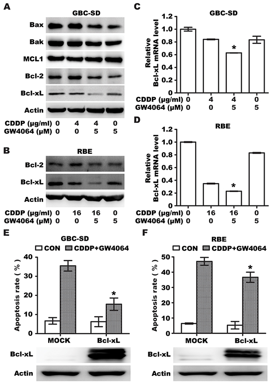 Figure 3: FXR agonist GW4064/CDDP co-treatment additively inhibits Bcl-xl expression. A. Protein levels of Bax, Bak, Bcl-2, MCL1 and Bcl-xL in GBC-SD cells treated with CDDP alone, GW4064 alone and CDDP/GW4064 combination for 36h. B. Protein levels of Bcl-2 and Bcl-xL in RBE cells treated with CDDP alone, GW4064 alone and CDDP/GW4064 combination for 36h. C, D. The mRNA levels of Bcl-xL in GBC-SD (C) and RBE (D) cells treated with CDDP alone, GW4064 alone and CDDP/GW4064 combination for 24h. Columns, mean of three experiments; bars, SD. *P <0.05, combination treatment group compared with CDDP-alone group. E. Apoptosis rate analysis using Annexin V/PI flow cytometry in GBC-SD cells transfected with Bcl-xL plasmid for 24h before treatment with CDDP (4μg/ml)/GW4064 (5μM) combination for 48 h. Columns, mean of three experiments; bars, SD. *P <0.05, Bcl-xL/CDDP+GW4064 group compared with MOCK/CDDP+GW4064 group. F. Apoptosis rate analysis using Annexin V/PI flow cytometry in RBE cells transfected with Bcl-xL plasmid for 24h before treatment with CDDP (16μg/ml)/GW4064 (5μM) combination for 48 h. Columns, mean of three experiments; bars, SD. *P <0.05, Bcl-xL/CDDP+GW4064 group compared with MOCK/CDDP+GW4064 group.