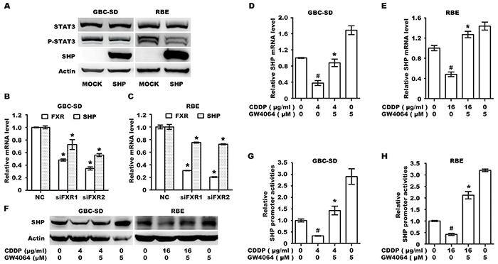 Figure 5: FXR agonist GW4064 could reverse CDDP-induced inhibition of SHP expression. A. Protein levels of SHP, P-STAT3 and STAT3 in GBC-SD and RBE cells transfected with MOCK or SHP plasmid for 72 h. B, C. The mRNA levels of SHP in GBC-SD (B) and RBE (C) cells transfected with control siRNA (NC) or FXR siRNA (siFXR) for 72 h. Columns, mean of three experiments; bars, SD. *P <0.05, siFXR group compared with NC group. D, E. The mRNA level of SHP in GBC-SD (D) and RBE (E) cells treated with CDDP alone, GW4064 alone and CDDP/GW4064 co-treatment for 12 h. Columns, mean of three experiments; bars, SD. #P <0.05, CDDP-alone group compared with control group. *P <0.05, combination treatment group compared with CDDP-alone group. F. The protein level of SHP in GBC-SD and RBE cells that were exposed to CDDP alone, GW4064 alone and CDDP/GW4064 co-treatment for 12 h. G, H. Luciferase reporter assay (RLA) in GBC-SD (G) and RBE (H) cells transfected with the SHP promoter reporter 24 h and then treated with CDDP alone, GW4064 alone and CDDP/GW4064 co-treatment for 12h. RLA was shown as mean±SD of three independent experiments. #P <0.05, CDDP-alone group compared with control group. *P <0.05, combination treatment group compared with CDDP-alone group.