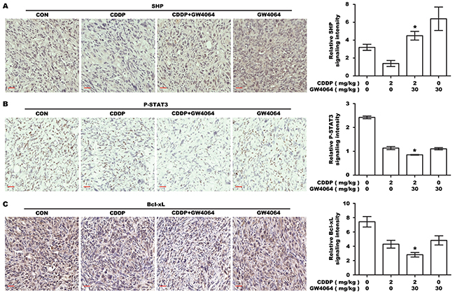 To examine the effect of FXR agonist/CDDP co-treatment on SHP-STAT3 signaling in vivo, IHC was performed on the tumor xenografts. As shown in Figure 7A, SHP expression in tumors was down-regulated by CDDP, but significantly reversed by GW4064/CDDP combined treatment. Phosphorylation of STAT3 and expression of Bcl-xL in tumors were down-regulated by CDDP, and in particular, more significantly by GW4064/CDDP combined treatment (Figure 7B, 7C). These results were in agreement with the results of the in vitro experiments.