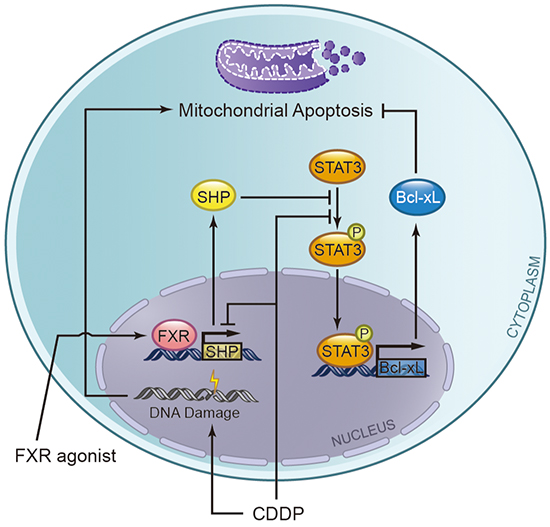 Figure 8: A hypothetical schematic representation of the effects of the combination of cisplatin (CDDP) plus FXR agonist on biliary tract cancer cells. FXR agonists can bind to its receptor FXR and then activate the SHP expression, which overcome CDDP mediated downregulation of SHP, and subsequently stimulates apoptosis via blocking anti-apoptotic protein Bcl-xL. Mechanistically, SHP inhibits STAT3 phosphorylation and then represses the expression of Bcl-xL.