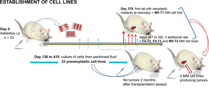 The cell lines used in this study belong to a biocollection established in 2011 [http://www.inserm-transfert.fr/]. To establish this biocollection, at 8 weeks of age, a group of 33 rats (16 males and 17 females) received an intraperitoneal inoculation of 10 mg crocidolite fibers suspended in 0.5 ml 0.9% NaCl (UICC analytical sample, ref. 02704A, Neyco, 75017 Paris, France). Between 136 and 415 days after induction, after euthanasia, 2 ml sterile RPMI medium was injected intraperitoneally, the peritoneal lavage fluids were collected under sterile conditions and then placed into culture. This step led to the establishment of 23 transformed mesothelial cell lines. After 378 days of induction, one male rat was necropsied about one hour after death, presenting signs of hemorrhage, widespread neoplastic implants and nodules in the peritoneal cavity as previously described [69], which, when dissociated with a scalpel and cultured, led to the first neoplastic MM cell line M5-T1. During the next two weeks, three additional MM cell lines were established from dissociated neoplastic implants and nodules were collected on two females and one male euthanized rats (F4-T2, F5-T1 and M5-T2). These cell lines were distinguished from the former 23 by their capacity to produce macroscopic tumors in syngeneic F344 rats three weeks after intraperitoneal inoculation of 5 x 106 cells.
