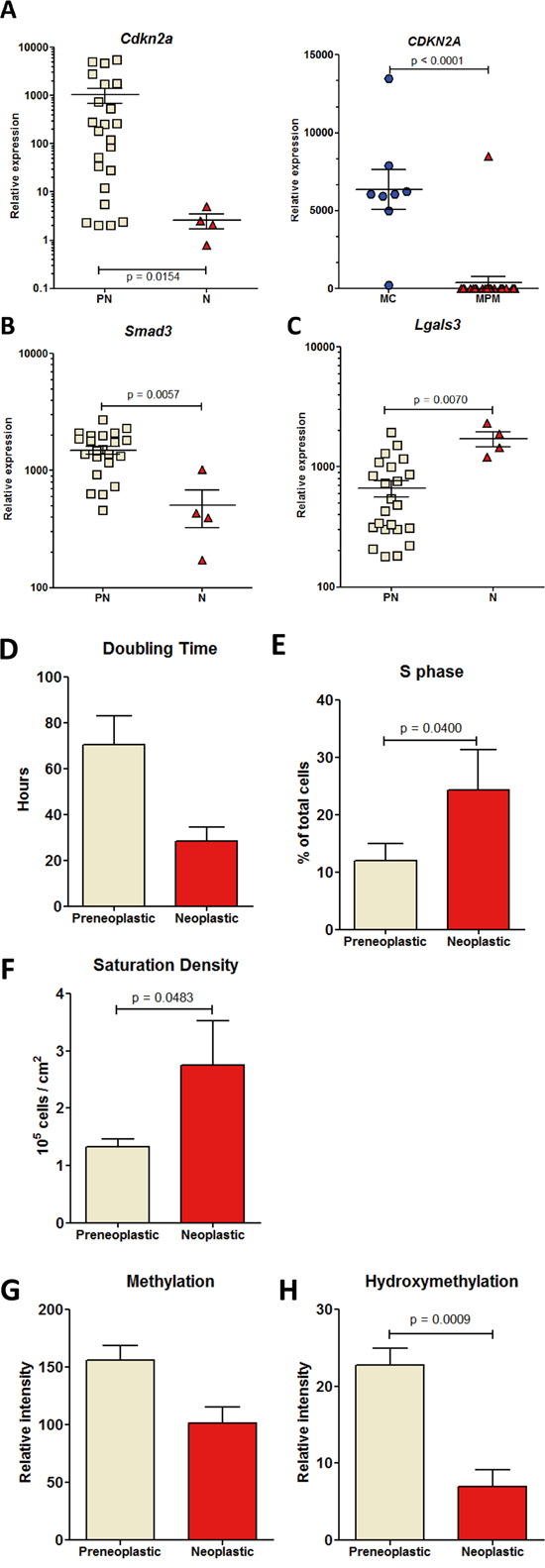 Cell lines were initially distinguished as preneoplastic (“PN”, n = 23) or neoplastic (“N”, n = 4) according to: observations at necropsy on the individual rats from which each cell line was established, cell morphology in culture, and propensity or not to produce tumors 2 months after orthotopic transplantation of 5 x 106 cells to syngeneic rats (Figure 1A). This discrimination was further confirmed by the analysis of expression profiles, growth patterns, and determination of the levels of cytosine methylation and hydroxymethylation. Analysis of Cdkn2a gene mRNA levels by qRT PCR revealed a significantly decreased relative expression in neoplastic relative to preneoplastic rat cell lines (Figure 2A, left). In human cell lines, the expression of Cdkn2a was also considerably decreased in pleural mesothelioma (MPM) relative to normal mesothelial cells (MC) (Figure 2A, right). A very significant decrease in the relative expression of Smad3 and increase in the relative expression of Lgals3 was also observed in neoplastic relative to preneoplastic rat cell lines (Figures 2B and 2C). Overall, compared with preneoplastic cell lines, neoplastic cells lines were characterized by a shorter mean doubling time (Figure 2D and Table S1), a higher proportion of cells in S phase (Figure 2E) and a higher saturation density (Figure 2F and Table S1). Cell migration analysis by scratching test did not reveal any difference between categories and groups of cell lines (Figure S1). As many solid malignant tumors show a dramatic decrease in their DNA methylation level relative to normal tisues, we analysed by dot blot the global methylation level in the two categories of cell lines and found that the level of cytosine methylation did not differ significantly between preneoplastic and neoplastic cell lines (Figure 2G). However, a very significant difference in the level of hydroxymethylation was observed, revealing an implication of this parameter during the tumorigenic process (Figure 2H).