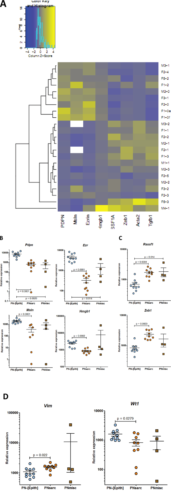 Figure 3: RT-PCR analysis of the expression of genes discriminating the different groups of preneoplastic rat mesothelial cell lines. A. Heatmap of expression profiles of the preneoplastic rat cell lines. Genes coding for B. podoplanin (Pdpn), ezrin (Ezr), mesothelin (Msln), HMGB1 (Hmgb1); C. RASSF1A (Rassf1), ZEB1 (Zeb1); D. vimentin (Vim), and WT1 (Wt1).