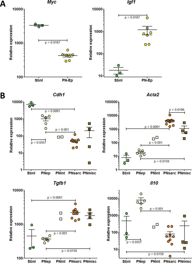 Among the preneoplastic cell lines with epithelial morphology, a first subgroup (named subnormal, “Subnl”) was identified by the highest expression of c-Myc, a proto-oncogene gene the deregulation of which contributes to deregulated DNA synthesis and genomic instability, and the lowest expression of Igf1, a gene involved in the deregulation of cellular energetics (Figure 4A). A second subgroup of cell lines (named PNep) differed from the former by a dramatic increase in the expression of Igf1 and Il10, coding for an anti-inflammatory cytokine, and a reduction in the mean expression of Cdh1, coding for the epithelial marker, E-cadherin (Figure 4B). Finally, a third subgroup of two cell lines, named PNint, represented an intermediate situation between the PNep and PNsarc subgroups, based on the relative expression of Cdh1, Acta2 and Tgfb1 (Figure 4B).