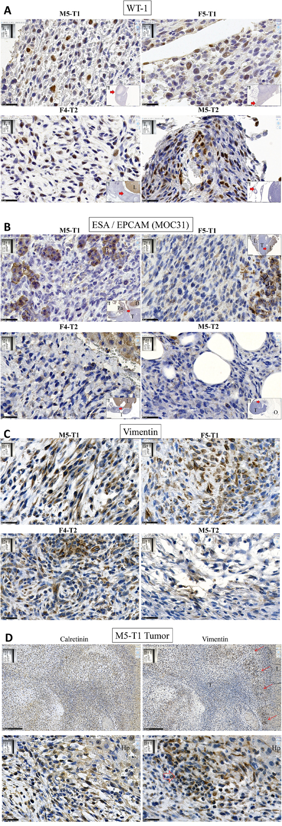 Figure 5: Immunohistochemical characterization of rat mesotheliomas. Immunohistochemical staining for A. WT1; B. ESA/EPCAM (MOC 31); C. vimentin of the tumors collected from syngeneic F344 rats after i.p. injection of the neoplastic rat cell lines M5-T1, F5-T1, F4-T2 and M5-T2, x 800, the scale bars represent 25 μm. Inserts show general views, x25, the scale bars represent 1 mm and the red arrow indicate the location of the magnification. Pa, pancreas; T, tumor; D, duodenum; L, liver; O, omentum. D. Comparison of IHC staining for calretinin (left) and vimentin (right) in a liver metastasis of M5-T1. Top, x 100, the scale bars represent 250 μm; bottom, x 800, the scale bars represent 25 μm; red arrows indicate foci of tumor cells exhibiting strong positivity of vimentin at the tumor front. Hp, hepatocytes.