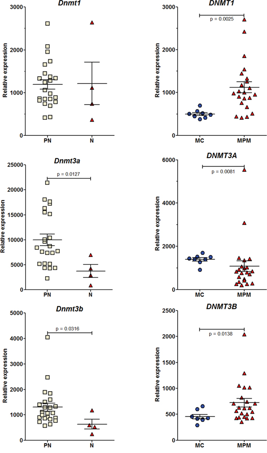 Global DNA hypomethylation and locus-specific DNA hypermethylation have been identified as key features of many cancers [55, 56]. In the specific case of mesothelioma, epigenetic dysregulation is now established to be a critical mode of action of asbestos, and it has been suggested to be associated with inflammation-related processes common to several cancers. A large study of epigenomic alterations in 158 pleural MM samples obtained from human patients revealed hundreds of loci that had different methylation levels between tumor and non tumor pleura, identifying seven distinct methylation subclasses and leading to the idea that asbestos-associated inflammation could drive this epigenetic diversity [57]. In the latter study, Dnmt3b was mentioned in the list of genes having significantly lower methylation in tumors, suggesting epigenetic dysregulation. This observation presents interesting connections with our findings in the rat biocollection of cell lines, a significant decrease in the expression of Dnmt3b being observed between all preneoplastic and neoplastic cell lines, as well as between the PNsarc group and neoplastic cell lines. The different evolution observed in the human biocollection for the expression of this enzyme, while a common pattern of expression profile was observed in the two species for Dnmt3a, could also be explained by recent reports indicating that the two enzymes have overlapping functions and that their roles in cancers may be more complex than previously believed [58]. In our study, the final fall in expression of de novo Dnmt3a and Dnmt3b could be explained by the recent demonstration of downregulation after induction of EMT by TGFβ in lung cancer cells [59]. Our results are also in good agreement with the recent finding that both de novo DNMTs showed a different pattern of expression relative to DNMT1 during carcinogenesis, with an overexpression in early cancer stages and a final reduced expression in tumors [60]. Thus, this event could represent the situation found in MM with the worst outcome. The involvement of DNA methylation in EMT has also been documented, hypermethylation of the promoter region being one of the key factors leading to a reduced mRNA expression of Cdh1 during EMT [61]. This could contribute to the final fall in the expression of Cdh1.