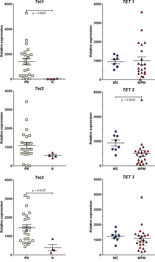 Dnmt3a expression showed a significant decrease in neoplastic compared to preneoplastic cells in both rat and human mesothelial cell lines (Figure 6). A significant decrease in the expression of Dnmt3b was also observed in the rat. In parallel, a decrease in the expression of all TET genes was observed in both species (Figure 7). However, this decrease was significant in the rat for TET1 and TET3 between preneoplastic and neoplastic cell lines (Figure 7), and in humans for TET2 between normal mesothelial cells (MC) and malignant pleural mesothelioma cell lines (MPM) (Figure 7). Of the four neoplastic rat cell lines, M5-T1 also presented the lowest expression of TET3 (117.5 vs. 255.5, 287.3, and 863.9 for the three others). Finally, among preneoplastic rat cell lines, a significant decrease in the expression of Dnmt3b and all TET genes was observed in the three invasive neoplastic cell lines, relative to the PNsarc group (Figure S5).