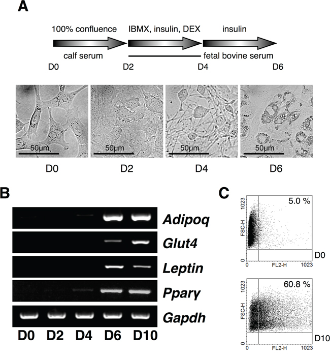 Figure 1: Expression analysis of USPs in adipocyte differentiation. A. A scheme for the induction of adipocytes with IBMX, DEX, and insulin from 3T3-L1 cells, and the cell morphology was checked every a couple of days at original magnification 40×. B. Primers for Adipoq, Glut4, Leptin, and Ppar-γ were used for RT-PCR using cDNA from each phase of the differentiating adipocytes. C. The differentiated adipocytes were assorted and analyzed by fluorescence-activated cell sorting (FACS).