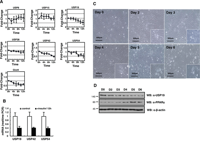 Figure 2: Expression profiling of DUB genes in the insulin-treated 3T3-L1 cells. A. USP8, USP15, USP19, USP42, and USP54 mRNA expressions were measured by real-time PCR as indicated. B. All data are performed three independent experiments with each insulin treated 3T3-L1 cells, and represent a means ± s.e.m. C. Primary MEFs induced adipocytes with IBMX, DEX, and insulin. Cell morphology was examined by a microscopy with 10× magnification. The scale bar represents 300 μm. D. Cell lysates were obtained from MEFs as indicated days, and analyzed by immunoblotting with an anti-USP19, an anti-PPAR-γ, and an anti-β-actin antibody.