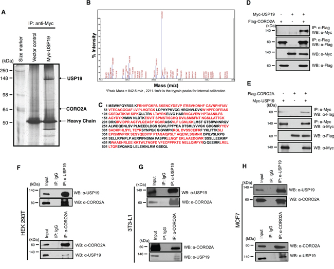 Figure 3: Putative binding proteins of USP19. Immunoprecipitation and MALDI-TOF-MS analyses were performed to investigate novel substrates for USP19. A. USP19 overexpression or a control sample in 293T cells, which were immunoprecipitated with an anti-Myc antibody and stained with the silver staining method. B. and C. Bands showing differential expression were selected and analyzed by MALDI-TOF-MS analysis. D. The interaction between USP19 and CORO2A was confirmed by an immunoprecipitation assay with an anti-Myc antibody and immunoblotting with anti-Flag and anti-Myc antibodies using Myc-tagged USP19 and/or Flag-tagged CORO2A overexpressed 293T cell lysates. E. Reciprocal data for D were obtained with respective antibodies. F-H. 293T, 3T3-L1, and MCF7 cell lysates were precipitated by an anti-USP19 antibody. USP19 and CORO2A were detected by anti-USP19 and anti-CORO2A antibodies, respectively. F-H, 293T, 3T3-L1, and MCF7 cell lysates were precipitated by an anti-CORO2A antibody. CORO2A and USP19 were detected by indicated antibodies.