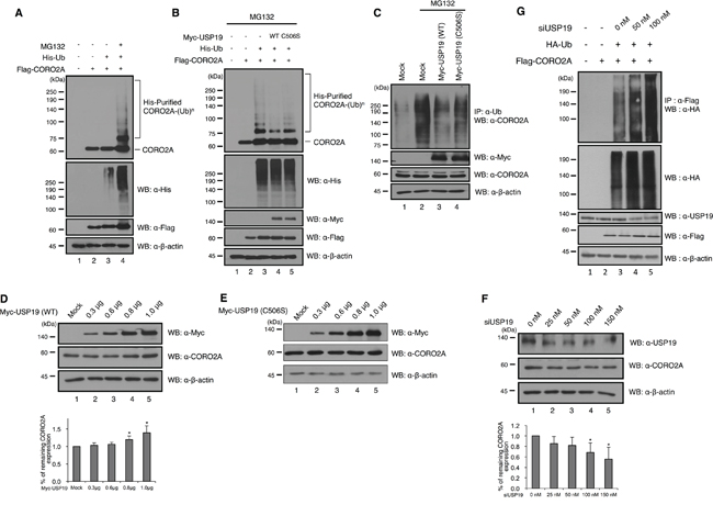 Figure 4: Deubiquitinating activity of USP19 on CORO2A. A. and B. Cell lysates from HEK 293T cells which transfected with His-tagged ubiquitin, Flag-tagged CORO2A and/or Myc-tagged USP19 and the catalytic mutant USP19 (C506S) were subjected to in vitro ubiquitination and deubiquitination assay with Ni-NTA beads. MG132 (2.5μM) as a proteasome inhibitor was treated for 6 h before cell harvest. Western blotting was performed with indicated antibodies. A, The ubiquitination level of CORO2A was increased when the cells were treated with MG132 (lane 4), a proteasome inhibitor. B, The overexpression of USP19, but not the catalytic mutant USP19 (C506S), dramatically reduced the ubiquitination level of CORO2A (lanes 4 and 5). C. In vivo ubiquitination and deubiquitination assays were performed to identify the specific deubiquitinating activity of USP19 toward CORO2A. Myc-tagged USP19 and the catalytic mutant USP19 (C506S) were overexpressed in the 293T cells, and the cell lysates were used for immunoprecipitation with an anti-ubiquitin antibody. Lane 1 shows the ubiquitination of CORO2A. D. and E. USP19 and the catalytic mutant USP19 (C506S) were transfected into 293T cells by dose dependent manner (0, 0.3, 0.6, 0.8, and 1.0 μg) and cell lysates were analyzed with indicated antibodies. F. USP19 siRNA was transfected into 293T cells by dose dependent manner (0, 25, 50, 100, and 150 nM), and the expression level of USP19 and CORO2A was detected by anti-USP19 and anti-CORO2A antibodies. D and F, Statistical data are presented as a means (n=3, *p<0.05). G. Lysates from cells which respectively transfected with USP19 siRNA, HA-tagged Ubiquitin, and Flag-tagged CORO2A were subjected to the ubiquitination assay.