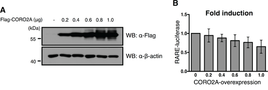 Figure 5: Effect of overexpression of CORO2A and USP19 on the transcriptional repression of RAR targeting elements. A. To confirm the dose dependent increase in Flag-tagged CORO2A in the MCF7 cells that contained the RARE reporter gene, immunoblotting with the same samples was performed with anti-Flag and anti-β-actin antibodies. B. The luciferase activity of RAR was gradually decreased in a dose dependent manner in response to a gradual increase in Flag-tagged CORO2A in the MCF7 cells. The average of six experiments is presented, and error bars denote the standard error mean (± s.e.m.).