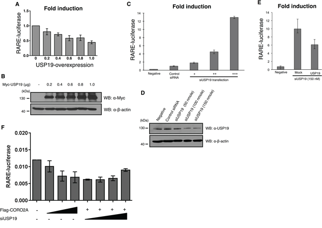 Figure 6: Effect of depletion of USP19 on RAR and PPAR-γ transcriptional activity. A. and B. The luciferase activity of RAR was gradually decreased in a dose dependent manner with a gradual increase in Myc-tagged USP19 in the MCF7 cells that contained the RARE reporter gene. A, MCF7 cells were transfected with Myc-tagged USP19 in a dose dependent manner and the luciferase activity of RAR was gradually decreased by the expression level of USP19. B, To confirm the dose dependent increase of USP19, immunoblotting with the same samples was performed with anti-Myc and anti-β-actin antibodies. C. The luciferase activity of RAR was analyzed in MCF7 cells transfected with USP19 siRNA in a dose dependent manner (+: 50 nmol, ++: 100 nmol, +++: 150 nmol), and the results indicate that the transcription level of RAR was dramatically increased. The luciferase activity of RARE was analyzed in USP19 siRNA transfected cells. D. To confirm the dose dependent decrease of USP19, immunoblotting with the same samples was performed with anti-USP19 and anti-β-actin antibodies. E. The luciferase activity of RAR was detected in MCF7 cells co-transfected with 150 nM of USP19 siRNA and 0.8 μg of Myc-tagged USP19. F. The luciferase activity of RAR in the presence or absence of CORO2A and USP19. All data obtained from six independent experiments and represent a means ± s.e.m.