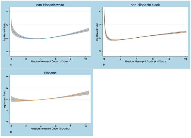 Figure 2: Partial residual plots that show the relationship of log HR with absolute neutrophil count (ANC). The logHR increases below an ANC cut-point that is higher in whites A. than in blacks B. No substantial increase in logHR at low ANC is seen in Hispanics C. The graphs are based on Cox PH regression models on fractional polynomials in ANC, adjusted for age, sex, Charlson comorbidity index, anemia and thrombocytopenia.