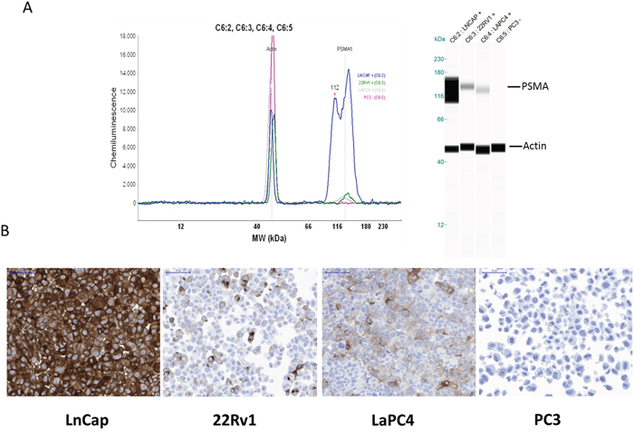 Figure 1: PSMA expression analyses of different prostate cancer cell lines (LNCaP, 22Rv1, LaPC4, and PC-3) by Western blot (A) or immunohistochemistry (B).
