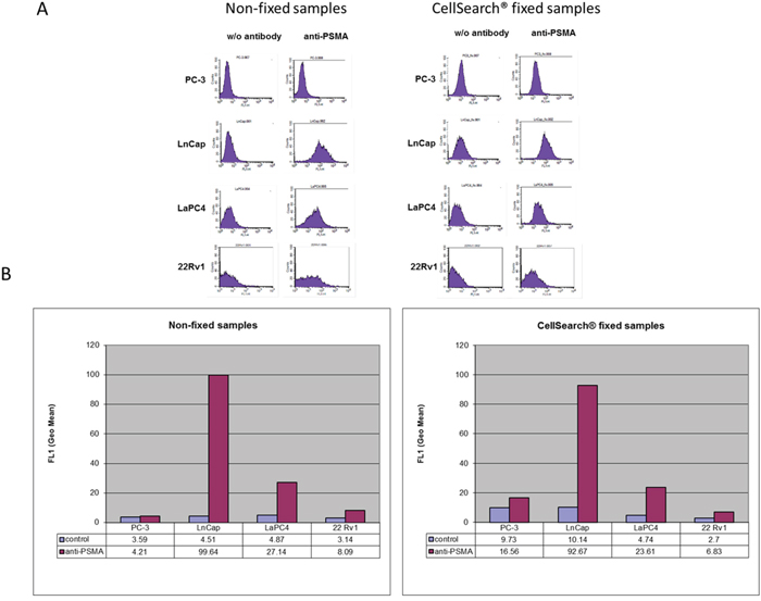PSMA expression levels were analyzed by flow cytometry on a FACSCalibur flow cytometer. Briefly, 2 x 105 CellSave-fixed or non-fixed tumor cells (PC-3, LaPC4, 22Rv1, or LNCaP) were used for the analysis. Samples were either non-fixed or treated with CellSearch® fixative for 24 hours at room temperature, washed three times with PBS containing 1 % BSA, then permeabilized by CellSearch permeabilization reagent for 15 min and washed three times with PBS containing 1 % BSA. Cells were then stained using 10 μg/ml in PBS containing 1 % BSA of the FITC-labelled PSMA antibodies (EXBIO #A4-539-C100, clone GCP-05; antibodies-online #ABIN492597, clone 107-1A4, and BioLegend #342506, clone LNI-17) for 30 min at 4°C. After three times washing with PBS containing 1 % BSA, cells were resuspended in PBS and tested by flow cytometry. Subcellular fragments were gated out by forward and side scatter.