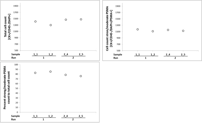 Figure 4: Precision, accuracy, and validity of the CellSearch®-PSMA assay. Blood from one donor was used, and transferred into CellSave® preservation tubes. Cells of the LNCaP line were spiked into blood by dilution series. Two samples were processed in parallel at day one (samples 1_1 to 1_2) in the same batch / run and two samples (2_4 and 2_5) were processed at day two. Samples 2_4 and 2_5 were stored at room temperature until analysis.