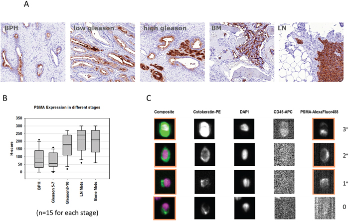 Figure 5: A and B. Tissue micro array (TMA) analyses from 75 prostate cancer patients with benign prostate hyperplasia (n = 15), gleason score 5 - 7 (n =15), gleason score 8 - 10 (n = 15), and patients with bone (BM) or lymph node (LN) metastases (n = 15 each). C. Representative images of circulating tumor cells detected by CellSearch® with different signal intensities for PSMA (score 0 - 3+).