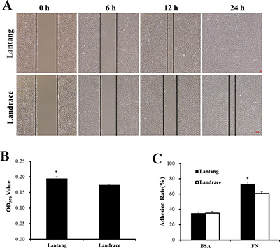 Figure 2: The differences in the migration and adhesion abilities of Lantang and Landrace SCs. (A) The migration ability of Lantang and Landrace SCs was compared using wound-healing assays. Scale bar: 50 μm. (B) Quantification of the number of migrated SCs in the transwell migration assay after 24 h migration. (C) Adhesion assays were performed to compare Lantang SCs with Landrace SCs. SCs were seeded in 96-well plates coated with fibronection (FN, 10 μg/mL) or Bovine serum albumin (BSA, 1%). The percent adhesion was calculated by dividing the absorbance of a well by the absorbance of the 100% input control. The results were representative of 3 separate experiments. Bars represent the means ± SEM. *Indicates a significant difference (P < 0.05).
