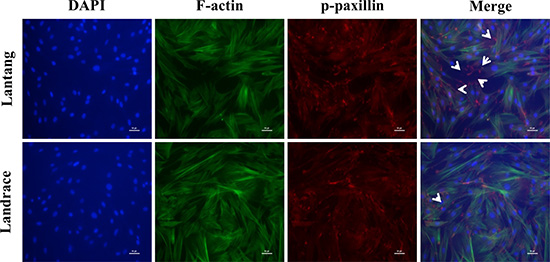 FAs are a crucial cell adhesion complex and play an essential role in maintaining attachments to the ECM. FAs act as signaling centers from which numerous signaling molecules regulate cell adhesion and migration [21]. Paxillin is a multi-domain adaptor protein that localizes primarily to FA sites. Immunofluorescence staining was used to investigate the phosphorylation level of paxillin (Tyr118) at 24 h after seeding on FN. Compared with Landrace SCs, Lantang SCs expressed many more active FA sites, which were indicated by the presence of p-paxillin, at the edges of the cell (Figure 3). Cell migration and adhesion are coordinated by receptor activation and fast intracellular responses of the actin cytoskeleton. Thus, the F-actin polymerization responses were analyzed in SCs. Representative F-actin staining indicated that Landrace SCs have more extensive F-actin in the cytoplasm than Lantang SCs (Figure 3). Overall, these results suggested that Lantang SCs had more FA proteins and fewer F-actin filaments than Landrace SCs.