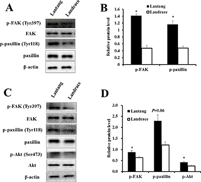 We investigated the protein expression of components of the FAK signaling pathway at 2 and 24 h culture in the adhesion and migration assays, respectively. Western blotting analysis showed that the protein expression of p-FAK at Tyr397, a major phosphorylation site during FAK activation, was greater in Lantang SCs compared with Landrace SCs under both conditions (migration and adhesion) (Figure 4A–4C). Additionally, the activation states of paxillin and Akt, which act downstream of FAK, were assessed. The data showed that the protein level of p-paxillin (Tyr118) in Lantang SCs was greater (P < 0.05) than that of Landrace SCs during migration (Figure 4B). Lantang SCs presented much greater protein expression of p-paxillin (P = 0.06) and p-Akt (Ser473) (P < 0.05) relative to Landrace SCs after adhesion for 2 h (Figure 4C–4D). These data indicated that the differences in the migration and adhesion abilities of SCs were associated with the activation of the FAK-paxillin signaling pathway.