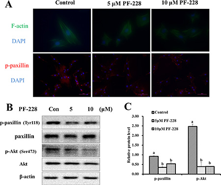 Figure 6: The expression of F-actin filaments, p-paxillin and p-Akt after 24 h of PF-228 treatment. (A) Immunofluorescence staining was used to examine the changes in F-actin filaments and p-paxillin expression after treatment with PF-228. (B) Western blot of p-paxillin, p-Akt in SCs after 24 h of PF-228 treatment. (C) The phosphorylation levels of paxillin and Akt were quantified relative to the respective total protein levels. The results shown are representative of 3 independent experiments. Bars represent the means ± SEM, n = 3. Scale bar: 100 μm.