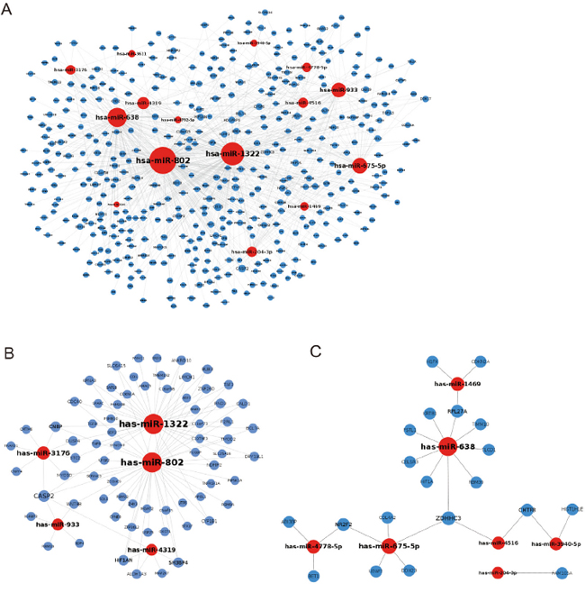 Figure 1: Inhibition of miRNAs to their target protein-encoding genes. A. The potential targets of differentially expressed miRNAs that were significantly modulated, as determined by miRNA microarray. B. Downregulated miRNAs and their potential upregulated target genes. C. Upregulated miRNAs and their potential downregulated target protein-encoding genes.