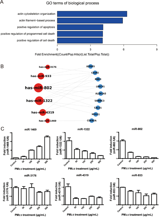 Figure 2: Functional analysis of the potential targets and validation of the significantly modulated miRNAs. A. The GO enrichment analysis of biological processes showed that most categories were involved in actin-dependent processes and apoptosis. B. Nine genes and their related miRNAs were involved in BP enrichment. C. The miRNA expression levels were validated by qRT-PCR in A549 cells. The expression of miR-1469, -1322, and -802 were modulated in a dose-dependent manner. * P < 0.05, compared with control.